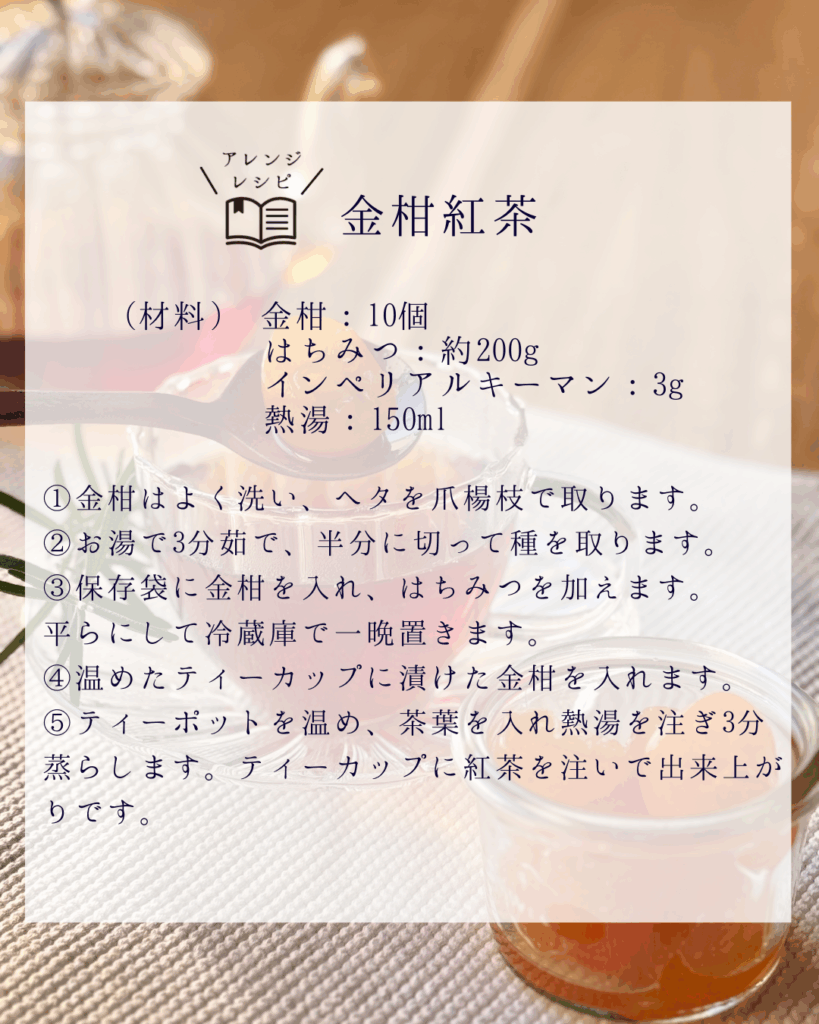 金柑紅茶 2026年01月03日 使用した紅茶はこちら KSL インペリアルキーマン 世界三大銘茶の一つ《キーマン》甘くやわらかな味わいは、蜂蜜の中に蘭の花を忍ばせたような香りで渋味が少なく、茶の旨味もしっかりした 非常に飲みやすい紅茶です。キーマン紅茶でしか味わえない甘みのある風味をストレートティーでお楽しみください。